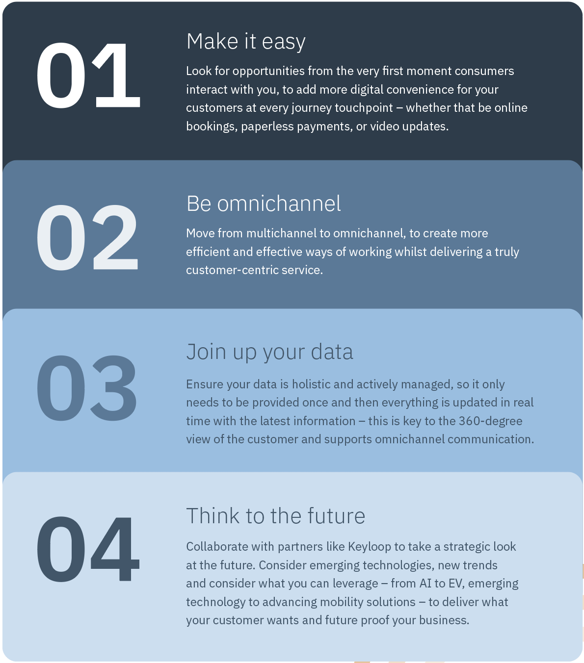 The experience-led economy relies on data. So, automotive retailers need to make sure all the data they have is being properly captured, managed, and used effectively to make the omnichannel experience as intuitive and personalised as possible for the customer.