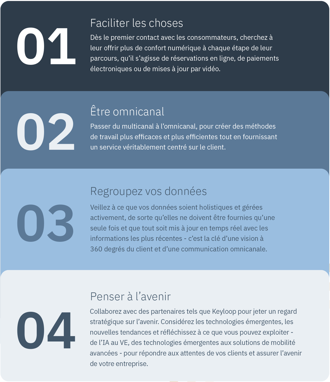Lorsque nous parlons de Keyloop aux entreprises du secteur automobile, elles reconnaissent toutes l’importance du premier point de contact et la création de valeur qui découle d’une bonne communication. Ils savent que la technologie peut les aider à résoudre ce problème et que le schéma directeur Experience-First de Keyloop fournit aux détaillants la feuille de route qui leur permettra de relever leurs défis en matière de communication multicanale.